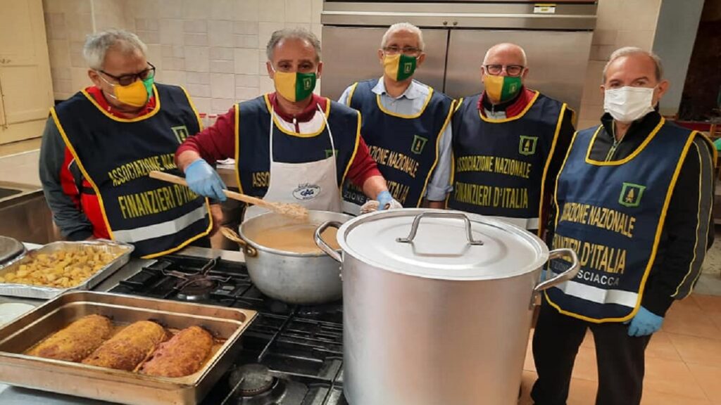SCIACCA. Il pranzo della domenica ieri alla mensa della solidarietà è stato preparato e servito dai finanzieri in congedo. Il gruppo ANFI di Sciacca guidato da Franco Zerilli ha portato generi alimentari e anche stoviglie donate alla mensa.