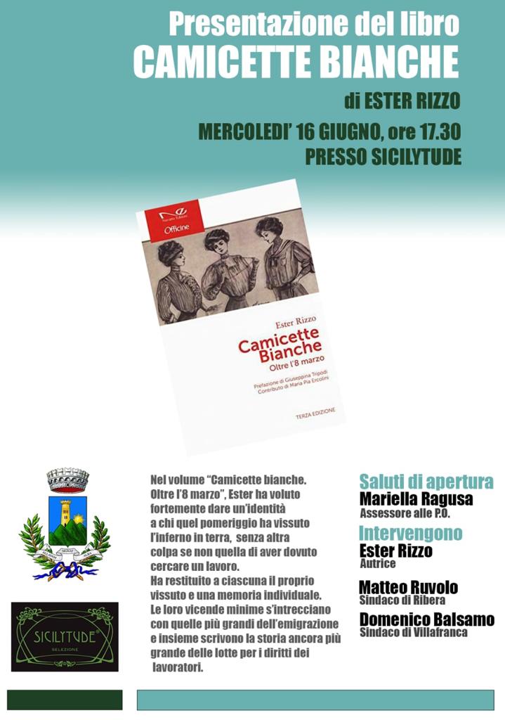 RIBERA. Il 16 giugno verrà presentato il libro “Camicette Bianche” di Ester Rizzo. L’iniziativa culturale è dell’assessorato alle Pari opportunità, guidato dall’assessore