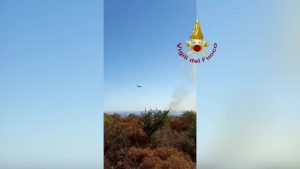 Vigili del fuoco e canadair in azione a Ostuni per lo spegnimento di un grosso incendio di vegetazione. abr/com