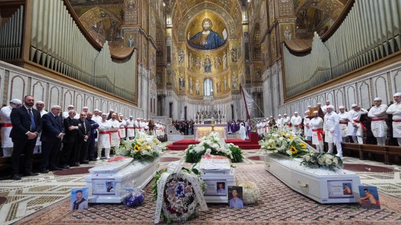 A Monreale migliaia di persone ai funerali di Andrea, Salvo e Massimo: «Per loro piange tutta l’Italia»