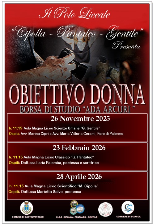 CASTELVETRANO- Si alza il sipario di “Obiettivo Donna” il 26 novembre prossimo con traguardo finale il 28 aprile quando sarà consegnata la borsa di studio in memoria di Ada Arcuri. La borsa di studio è una iniziativa del Corrieredisciacca.it, giornale online diretto dal giornalista Filippo Cardinale, il quale dedica l’iniziativa, giunta alla terza edizione, in memoria della moglie Ada Arcuri deceduta nel 2021 per un tumore. L’iniziativa è sposata dal Polo Liceale ” Cipolla- Gentile- Pantaleo ” di Castelvetrano con la Dirigente Scolastica dott.ssa Giulia Flavio. Il primo appuntamento è il 26 novembre ore 11:15 nell’aula Magna Liceo Scienze Umane. Nel primo appuntamento relazioneranno due giuriste esperte in Violenza di Genere e Codice Rosso, l’avvocata Marina Cipri e Maria Vittoria Cerami.