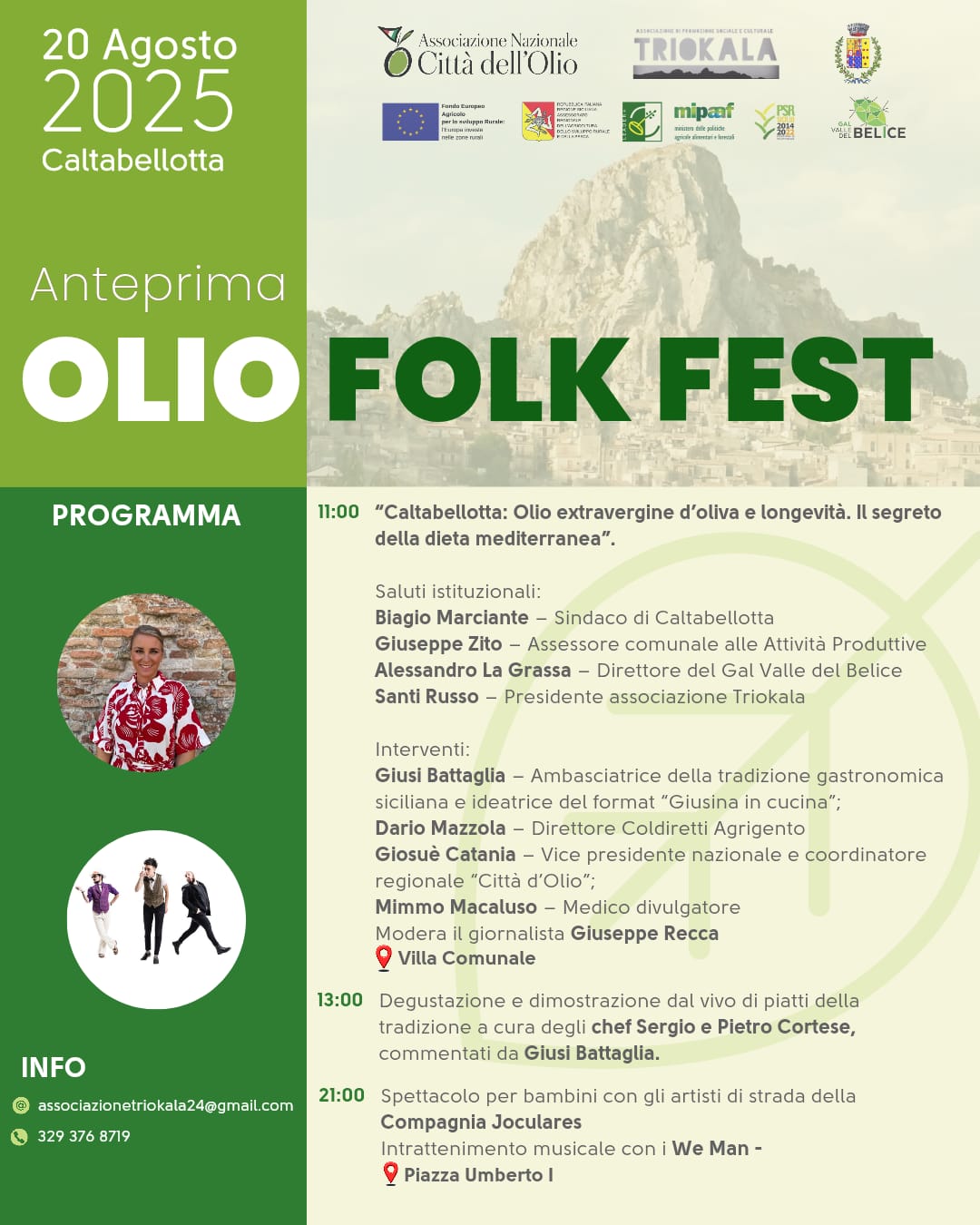 “Olio Folk Fest” è solo il primo passo di un progetto più ampio: promuovere l’olio di Caltabellotta attraverso eventi itineranti durante tutto l’anno, valorizzando il territorio e le sue eccellenze in ogni stagione.