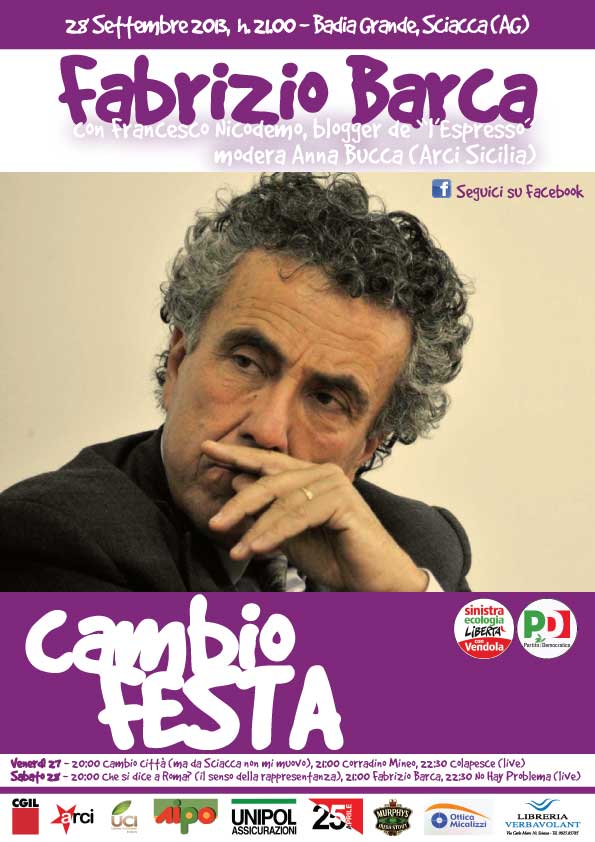 All’evento parteciperà anche l’assessore regionale alla formazione Nelli Scilabra, reduce dalle ultime fibrillazioni del governo Crocetta. Alle 21:00 toccherà all’ex ministro per la Coesione territoriale Fabrizio Barca scaldare gli animi, mentre alle 22.30 il concerto dei No Hay Problema chiuderà la festa a ritmo di bolero e cha cha cha. Alle 24:00, dicono gli organizzatori, ci sarà una sorpresa.