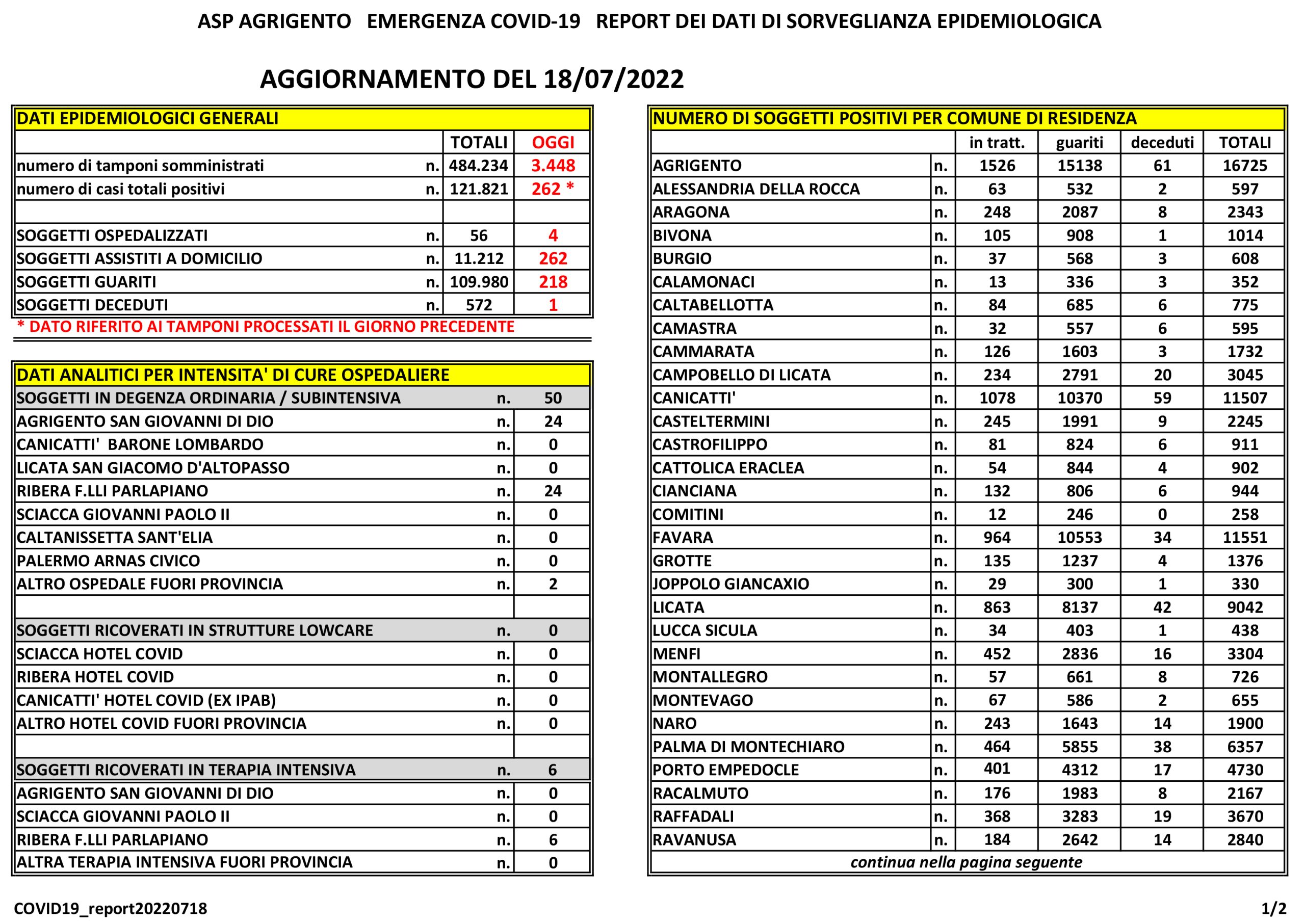 PROVINCIA DI AGRIGENTO- Sono stati processati 797 tamponi con 262 esiti positivi al covid, par al 32,87%. Una percentuale di incidenza inferiore rispetto al 50% delle settimane scorse. Il report dell’Asp di Agrigento, diffuso oggi e riferito a ieri, registra 262 nuovi casi di positività al covid a fronte di 218 guarigioni. C’è un decesso avvenuto a Favara. Gli attuali contagiati, in provincia, sono 11.268 di cui 56 ospedalizzati (6 in terapia intensiva). Al Fratelli Parlapiano di Ribera sono occupati 24 posti letto su 30 disponibili in medicina covid, mentre 6 posti letto su 10 sono occupati in terapia intensiva. Al San Giovanni di Dio di Agrigento sono ricoverati 24 soggetti in medicina covid.