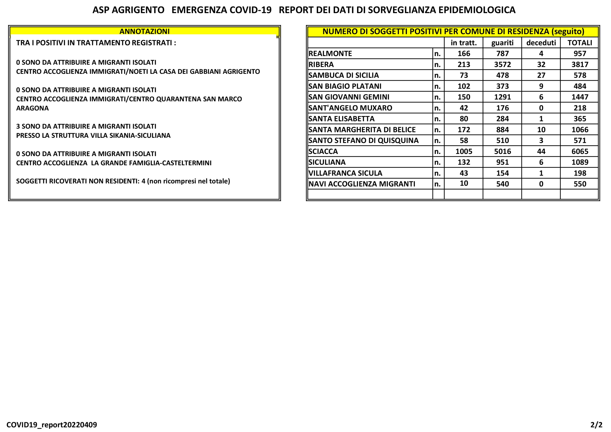 PROVINCIA DI AGRIGENTO- Il virus circola e alimenta i contagi. Negli ultimi due giorni, 9 e 10 aprile, nella nostra provincia si sono registrati 852 nuovi casi di positività, 233 guarigioni e 1 decesso. Gli attuali contagiati sono 11.464 di cui 44 ospedalizzati in medicina covid e 1 in rianimazione covid.