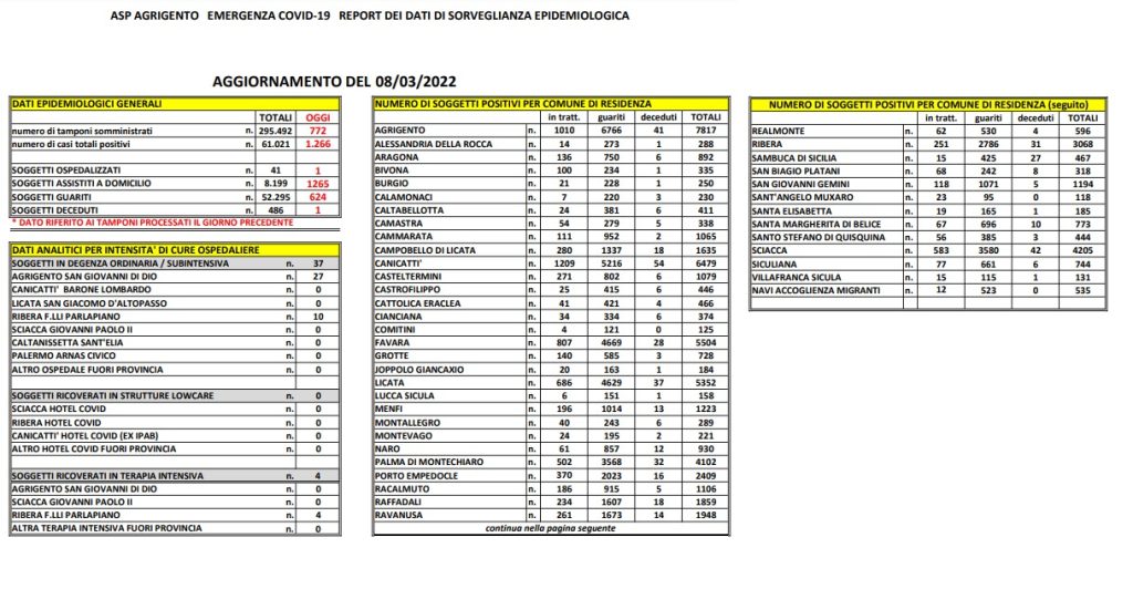 Un decesso, un nuovo ingresso in ospedale, 1266 nuovi casi positivi e 624 guarigioni nel report diffuso dall’Asp di Agrigento in serata, riferito alla giornata di martedi 8 marzo.