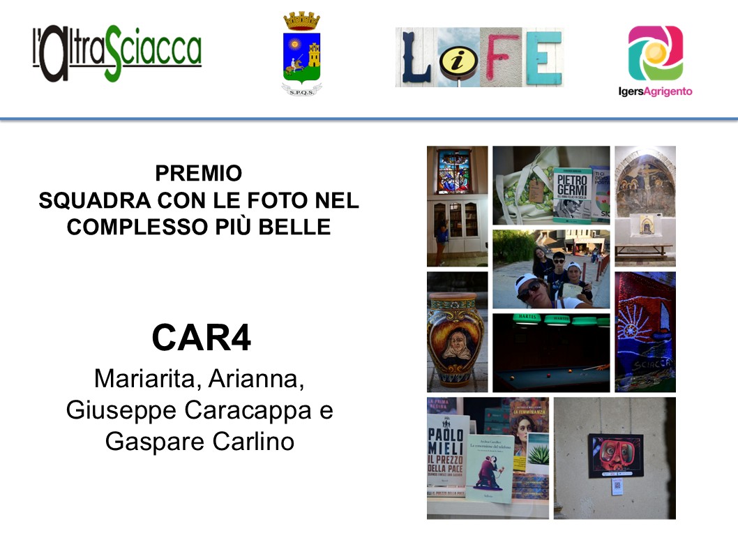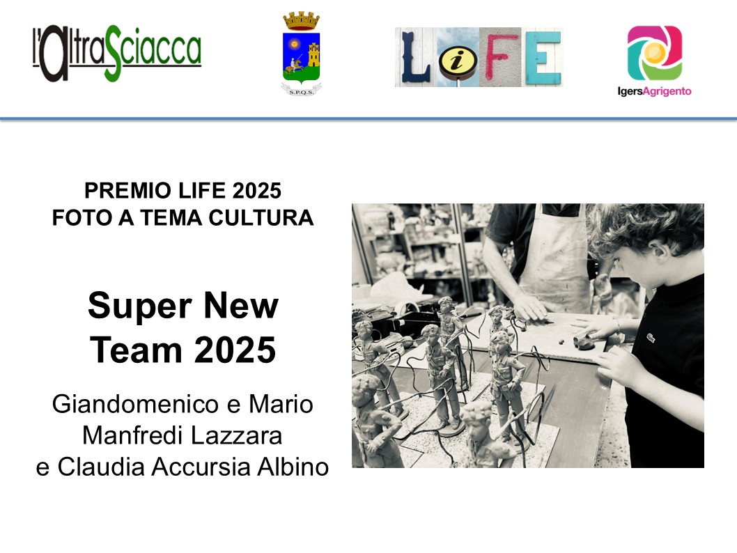 Durante la stessa cerimonia, sono stati consegnati anche i premi della Caccia al Tesoro Fotografica LIFE 2025. La giuria – composta da Ambra Favetta, Francesca Mannias e Nino Sabella – ha premiato la squadra Car4 (Mariarita, Arianna e Giuseppe Caracappa, Gaspare Carlino) per la qualità complessiva degli scatti. Il premio per la miglior foto a tema cultura è andato alla squadra Super New Team 2025 (Giandomenico e Mario Manfredi Lazzara, Claudia Accursia Albino), con un’immagine che celebra il dialogo tra generazioni attraverso l’arte della ceramica. I local manager di Igers Agrigento hanno invece premiato la squadra “I tonnaroti” (Silvio Scaduto e Valentina Craparo) per la miglior foto legata all’obiettivo Instagram della caccia al tesoro. I premi includevano buoni libro, aperitivi e un’esperienza subacquea nei fondali della Ferdinandea, offerta da Marevivo Sicilia.