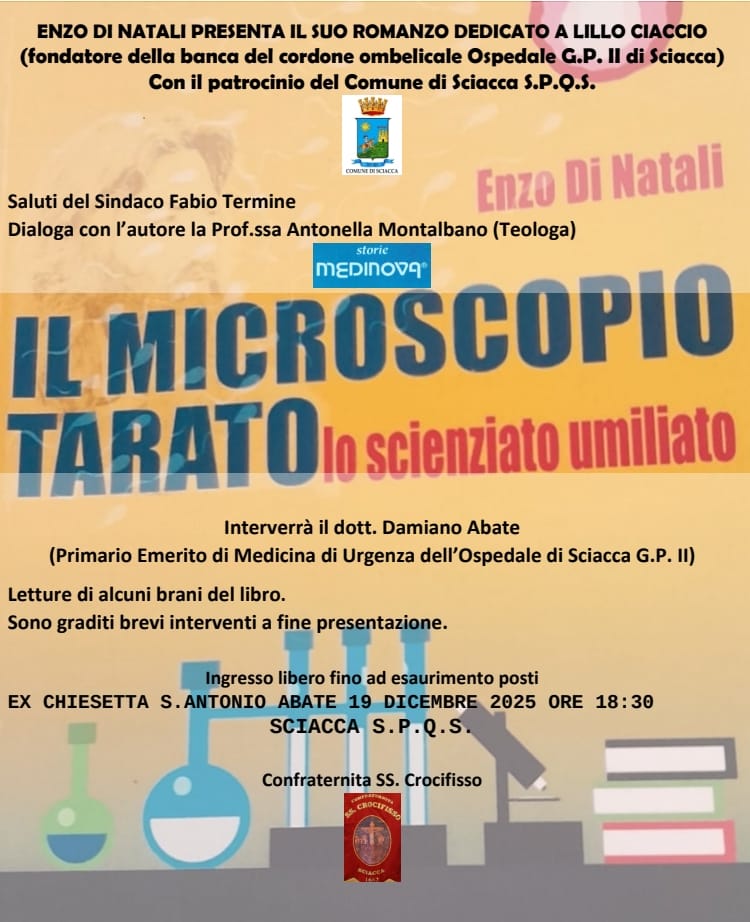 SCIACCA. Si ispira alla vicenda scientifica ed umana di Lillo Ciaccio, l’ematologo saccense fondatore della Banca del cordone ombelicale, il libro che verrà presentato questa sera a Sciacca. Enzo Di Natali, teologo esperto di bioetica, ha seguito la storia di Ciaccio e le sue ricerche e scritto il romanzo “Il microscopio tarato lo scienziato umiliato”. La presentazione oggi alle 18.30 presso l’ex chiesetta S.Antonio Abate. Sarà presente l’autore, che dialogherà con la teologa Antonella Montalbano. Interverrà Damiano Abate, primario emerito di Medicina d’urgenza dell’ospedale di Sciacca. L’iniziativa è organizzata dalla Confraternità SS Crocifisso con il patrocinio del Comune di Sciacca.