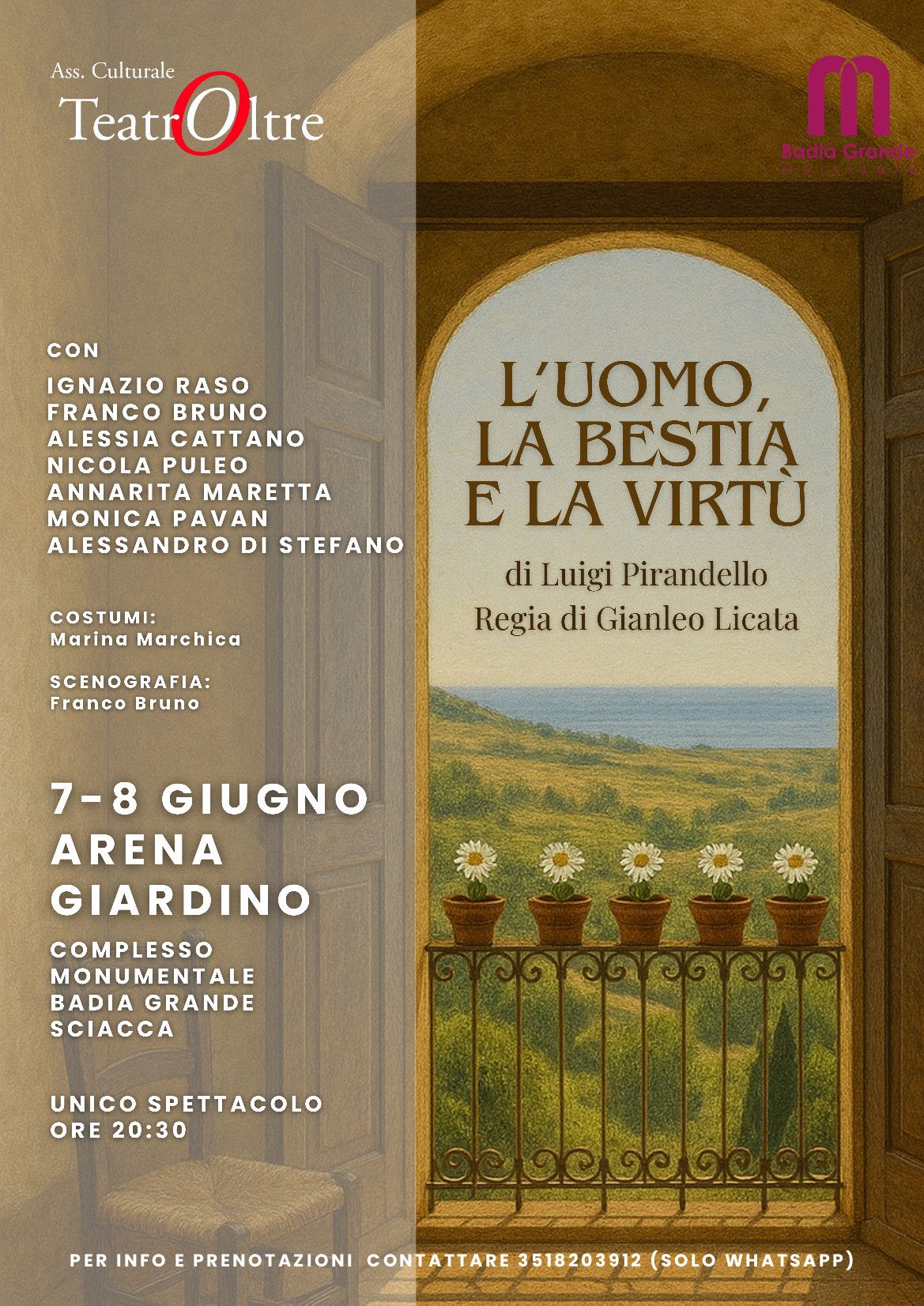 SCIACCA. “L’uomo, la bestia e la virtù” di Luigi Pirandello, in scena sabato 7 e domenica 8 giugno presso l’arena giardino Badia Grande di Sciacca, nell’ambito della rassegna “Teatro in Badia”. La rappresentazione, una delle tragicommedie pirandelliane più rappresentate al mondo (una donna sposata, un marito lontano e ostile, un amante molto “civile”) è a cura dell’associazione culturale Teatroltre, con la regia di Gianleo Licata. Protagonisti Ignazio Raso, Franco Bruno, Alessia Cattano, Nicola Puleo, Annarita Maretta, Monica Pavan e Alessandro Di Stefano. Una commedia di grande impatto quella che Pirandello oltre 100 anni fa proponeva al lettore ed allo spettatore: una situazione che ad una prima lettura parrebbe un solido triangolo tra moglie, marito e amante. Invece il sentimento del contrario, definizione dell’umorismo pirandelliano, rovescia la morale borghese. È infatti paradossalmente l’amante che cerca in tutti i modi di buttare la moglie tra le braccia del marito!