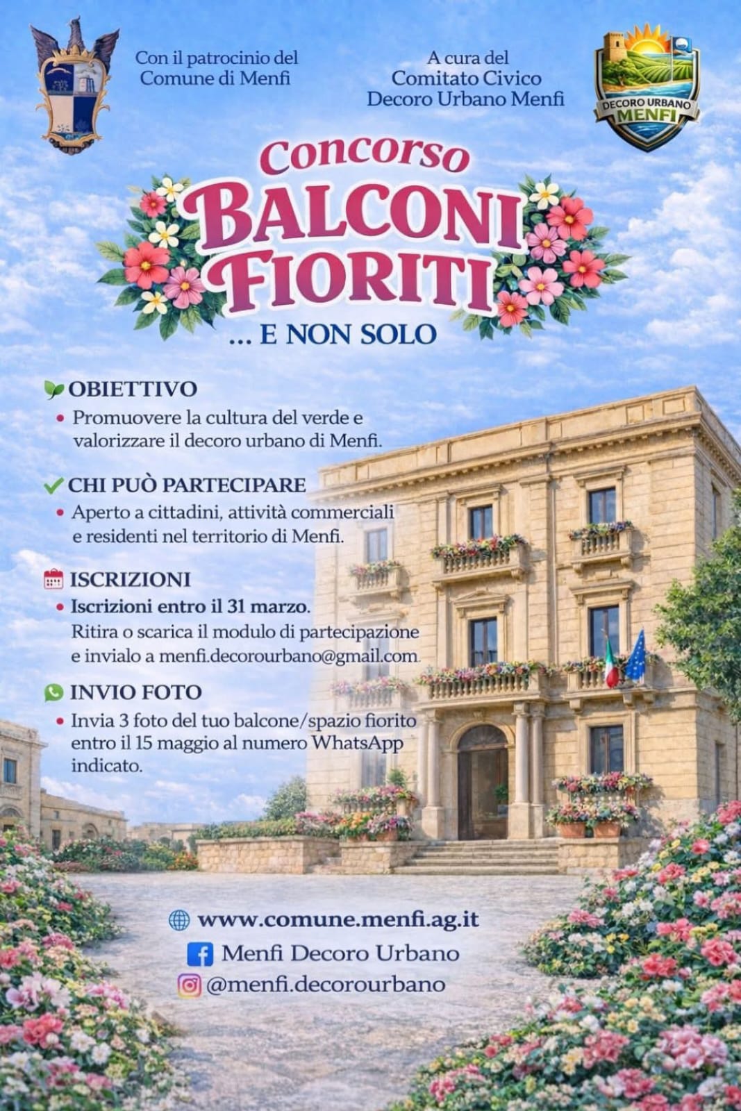 Su iniziativa del Comitato Civico “Decoro Urbano Menfi – per una Città Curata, Sostenibile e Partecipata”, e con il patrocinio del Comune di Menfi, nasce il concorso “Balconi Fioriti e non solo…”, un invito aperto alla cittadinanza a rendere più bello e accogliente il paesaggio urbano. L’idea alla base del progetto è semplice ma potente: fiori, piante e verde non sono solo elementi decorativi, ma segnali di cura, benessere, cultura ecologica e attenzione verso il luogo in cui si vive. Nell’arredo urbano contribuiscono a migliorare la qualità della vita, a rendere le città più ospitali e a rafforzare il senso di appartenenza alla comunità. Con il concorso, Menfi chiama i cittadini a diventare protagonisti attivi della bellezza collettiva, trasformando balconi, finestre, davanzali, cortili, terrazzi e ingressi in piccoli spazi di colore e armonia. “Un gesto semplice che, insieme, può fare la differenza e rendere il nostro paesaggio urbano più vivo, umano e condiviso”, spiegano gli organizzatori. La partecipazione è gratuita e aperta a tutti: residenti in abitazioni di proprietà o in affitto, ma anche titolari di esercizi commerciali. “Tutti possono partecipare, perché la bellezza dei nostri balconi è bellezza per l’intera città”, sottolinea il Comitato. Il bando e il modulo di iscrizione sono disponibili sulla pagina Facebook del Comitato Civico “Menfi Decoro Urbano”. Un’iniziativa che punta a unire creatività, senso civico e amore per il territorio, trasformando Menfi in un mosaico diffuso di colori e natura.