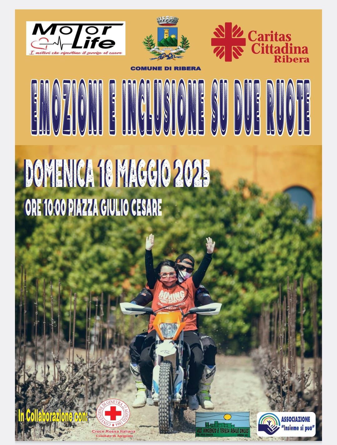 RIBERA. Si intitola “Motorlife – Emozioni e Inclusione su Due Ruote”, la manifestazione che si terrà a Ribera il prossimo 18 maggio 2025. L’iniziativa, ispirata al format di “mototerapia inclusiva” già promosso con successo in altre realtà italiane, nasce con l’intento di offrire un’occasione di incontro, divertimento e crescita per bambini e ragazzi con disabilità e le loro famiglie, abbattendo barriere fisiche e psicologiche attraverso il contatto con il mondo delle due ruote. Durante la mattinata di domenica 18 maggio, i partecipanti avranno la possibilità di vivere l’emozione di salire in sella a moto da cross in un ambiente sicuro e controllato, guidati da volontari esperti e piloti professionisti. L’evento prevede inoltre momenti di animazione, laboratori creativi, stand informativi e la partecipazione di associazioni e istituzioni locali impegnate nel sociale.