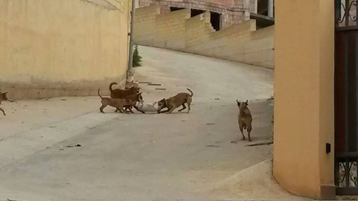 Ecco, come si vede nella drammatica foto, quello che succede nelle strade del quartiere: un cagnolino in preda ad un branco di cani che lo azzannano. Chi ha assistito alla scena avrebbe voluto intervenire, ma per paura ha preferito stare alla larga da cani affamati e pericolosi.