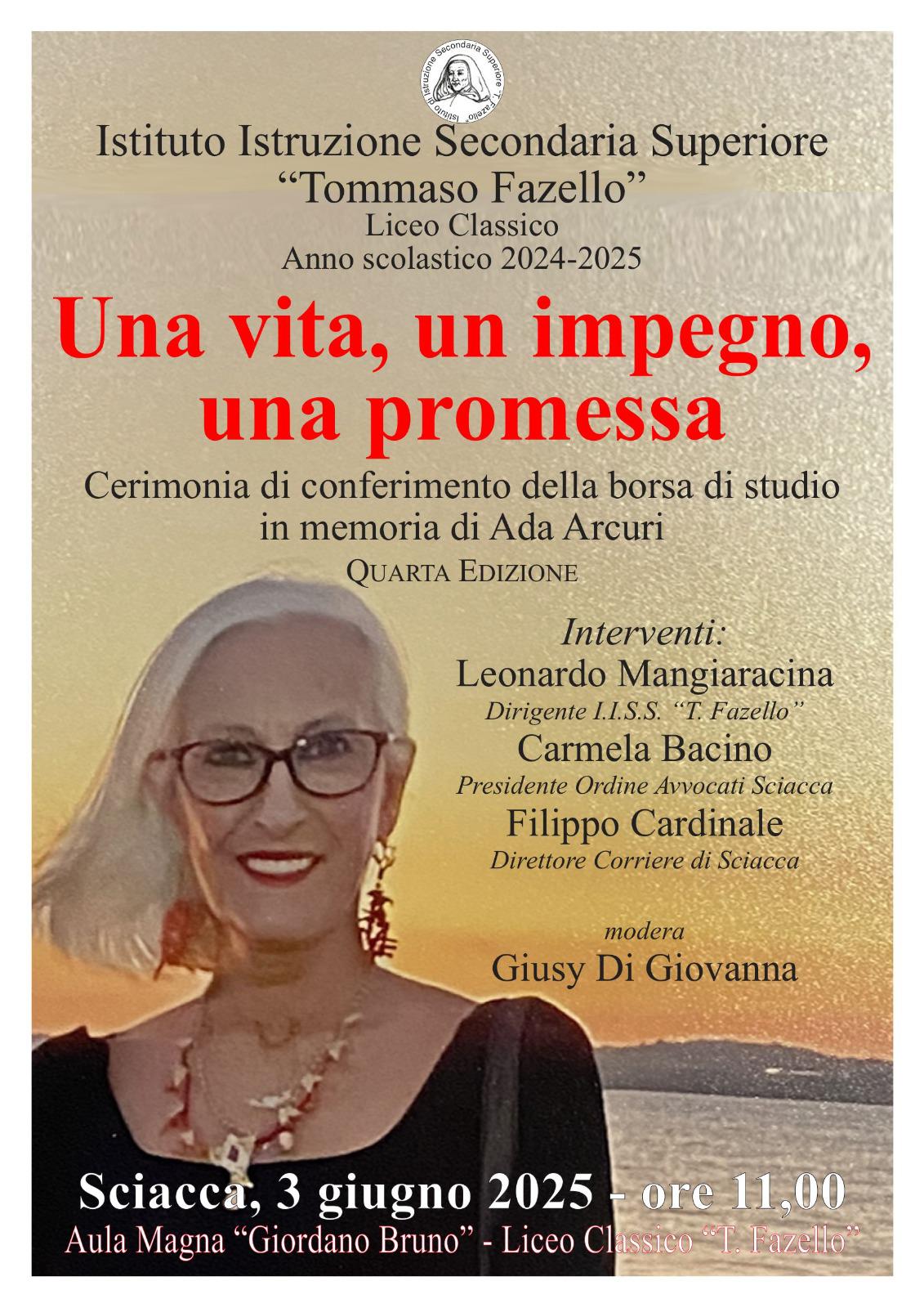 SCIACCA. Si svolge oggi, martedi 3 giugno, alle ore 11, presso l’Aula Magna “Giordano Bruno” del Liceo classico Tommaso Fazello di Sciacca, la cerimonia di consegna dell’edizione 2025 della borsa di studio in memoria di Ada Arcuri. L’iniziativa è giunta alla quarta edizione e con il titolo “Una vita, un impegno, una promessa”, si vuole ricordare la figura di Ada Arcuri e passare il suo messaggio alle future generazioni. La borsa di studio verrà assegnata a studenti del quinto anno che nel corso del loro percorso di studio si sono distinti, oltre che per una buona media voti, anche per l’impegno sociale e solidale. Previsti gli interventi del dirigente scolastico Leonardo Mangiaracina, del presidente dell’Ordine degli avvocati di Sciacca Carmela Bacino, del direttore del Corriere di Sciacca Filippo Cardinale.