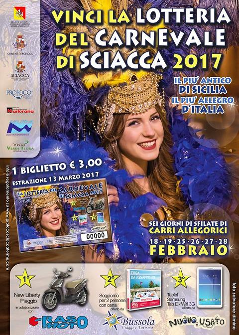 Arriva la lotteria del Carnevale di Sciacca. In palio ci sono un Piaggio Liberty, un Tablet oppure un soggiorno per due persone. La Lotteria del Carnevale di Sciacca 2017 è autorizzata dall’Amministrazione Autonoma dei Monopoli di Stato; organizzata dalla Pro Loco Sciacca Terme in collaborazione con Raso Moto, La Bussola Viaggi e Turismo, Nuovo e Usato.