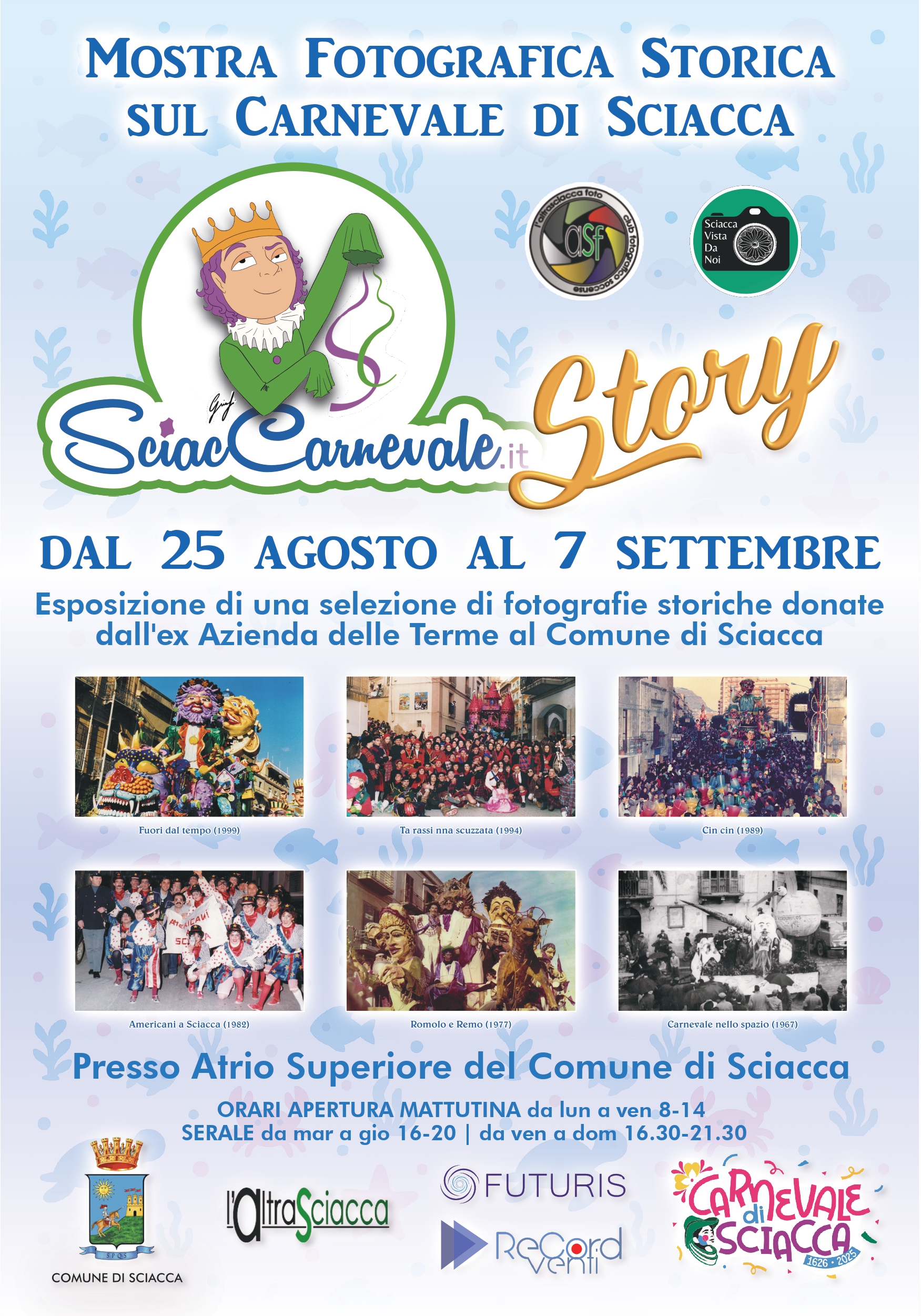La magia e la storia del Carnevale di Sciacca rivivono in una mostra fotografica che ne celebra l’evoluzione nel tempo. Da oggi 25 agosto, fino al 7 settembre 2025, l’Atrio Superiore del Comune di SciaccaCospiterà “SciacCarnevale Story”, un’esposizione che racconta il percorso di questa secolare tradizione.