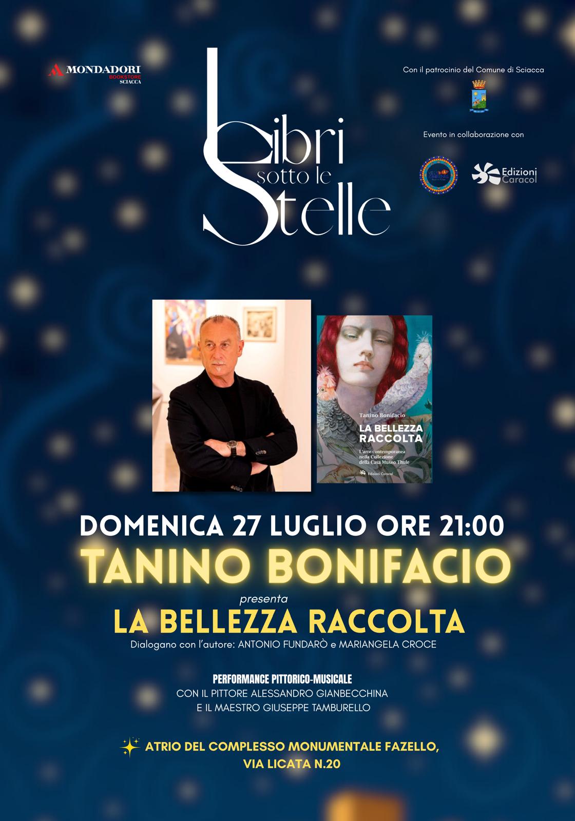 SCIACCA. Terzo appuntamento della Rassegna Letteraria “Libri sotto le stelle” organizzata dalla Mondadori Bookstore di Sciacca nella nuova location dell’Atrio del complesso monumentale Fazello (ingresso da Via Licata n.20), con il patrocinio del Comune di Sciacca. Domenica 27 luglio, ore 21,00 il critico d’arte Tanino Bonifacio presenta il saggio “La bellezza raccolta” edito dalla casa editrice Caracol. Il saggio, arricchito dalla prefazione dello storico dell’arte Aldo Gerbino e da un testo del critico letterario e saggista Salvatore Ferlita, analizza in chiave storico-critica le opere d’arte contemporanea presenti nella collezione della Casa Museo Thule del filosofo e poeta Tommaso Romano, sita a Palermo, all’interno di un palazzo “liberty” del 1898 in via Ammiraglio Gravina 95. Un racconto di artisti che operano dalla seconda metà del ‘900 fino ad oggi con i molteplici stili dell’arte contemporanea sempre incline a continui processi evolutivi, come Fortunato De Pero, Renato Guttuso, Marino Mazzacurati, Salvatore Fiume, Giuseppe Migneco, Bruno Caruso, Gianbecchina, Sebastian Matta, Renato Mambor, Enrico Baj e Tano Festa. L’autore affronta anche il tema del collezionismo come fenomeno storico e psicologico nel quale la Casa Museo diventa la narrazione simbolica della vita intima, spirituale e culturale del collezionista e la testimonianza dell’affascinante intreccio tra arte e vita.