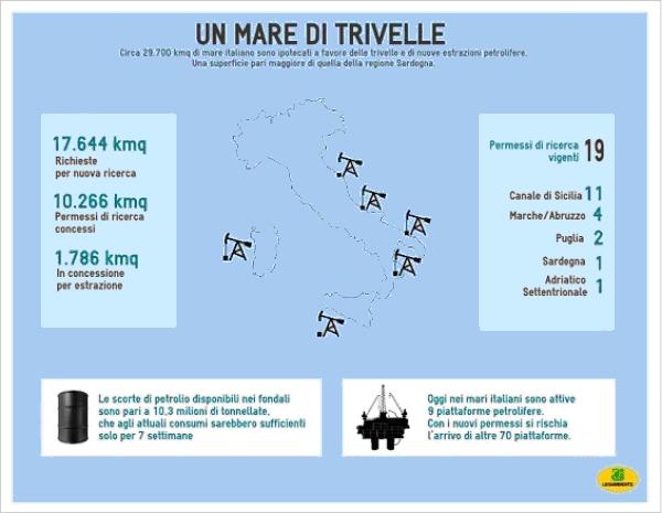 Attualmente, 10.266 km2 di mare italiano sono oggetto di 19 permessi di ricerca petrolifera già rilasciati (gli ultimi due sono stati sbloccati il 15 giugno scorso nel tratto abruzzese di Adriatico di fronte la costa tra Vasto e Ortona); 17.644 km2 di mare minacciati da 41 richieste di ricerca petrolifera non ancora rilasciate ma in attesa di valutazione e autorizzazione da parte del Ministero dello Sviluppo Economico. In definitiva, tra aree già trivellate e quelle che a breve rischiano la stessa sorte, si tratta di circa 29.700 kmq di mare, una superficie più grande di quella della regione Sardegna».